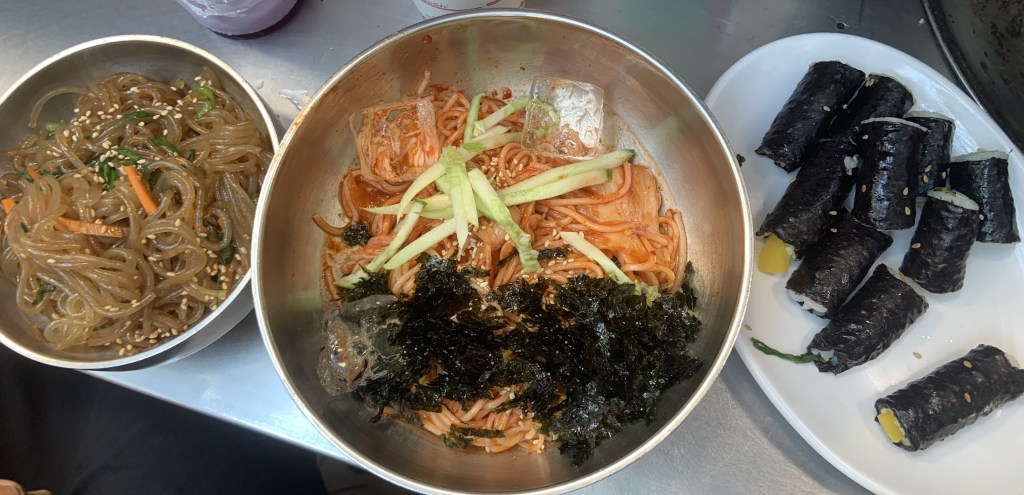 Like Taipei, Soul also has a food market culture. I was staying close to Gwangjang market, so I had to check it out immediately. This is one of the more traditional markets of Seoul, and you can find foods like mung bean cakes, gimpab (seaweed rolls), dumplings, chicken feet, japchae (Korean glass stir-fried noodles), beef tartar, blood sausage, rice cakes, kimchi bibim guksu (spicy cold noodles with kimchi), and red bean porridge.