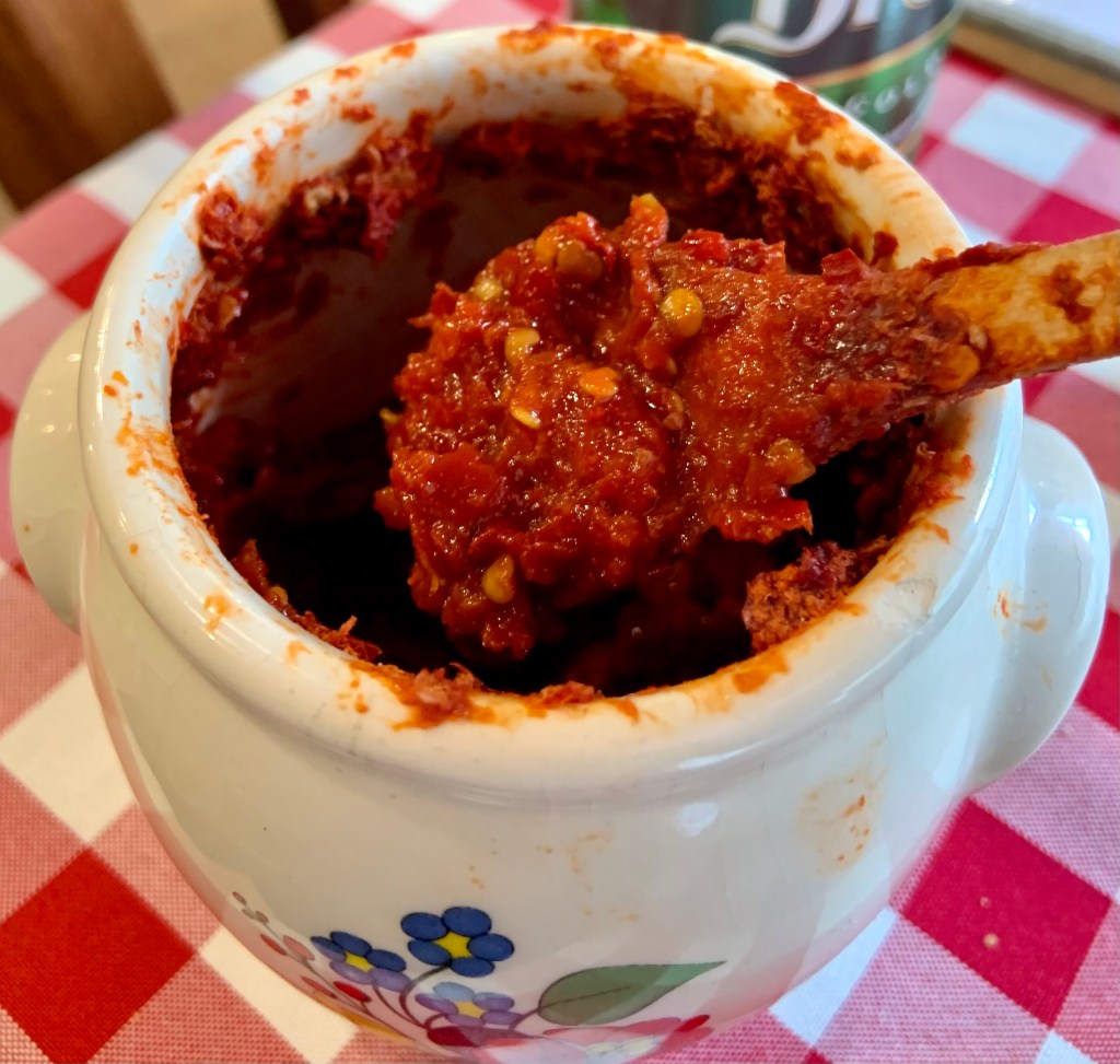 The mate container itself has quite an interesting look, resembling something primitive or indigenous, and it definitely caught my eye as I was perusing through the streets. It is shaped like a small oval gourd and has a small metal straw (bombilla) and chopped green yerba mate herbs protruding out of it. This can be better depicted below.
